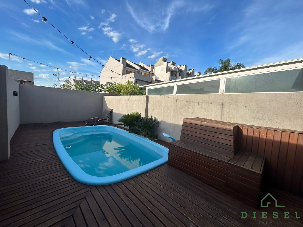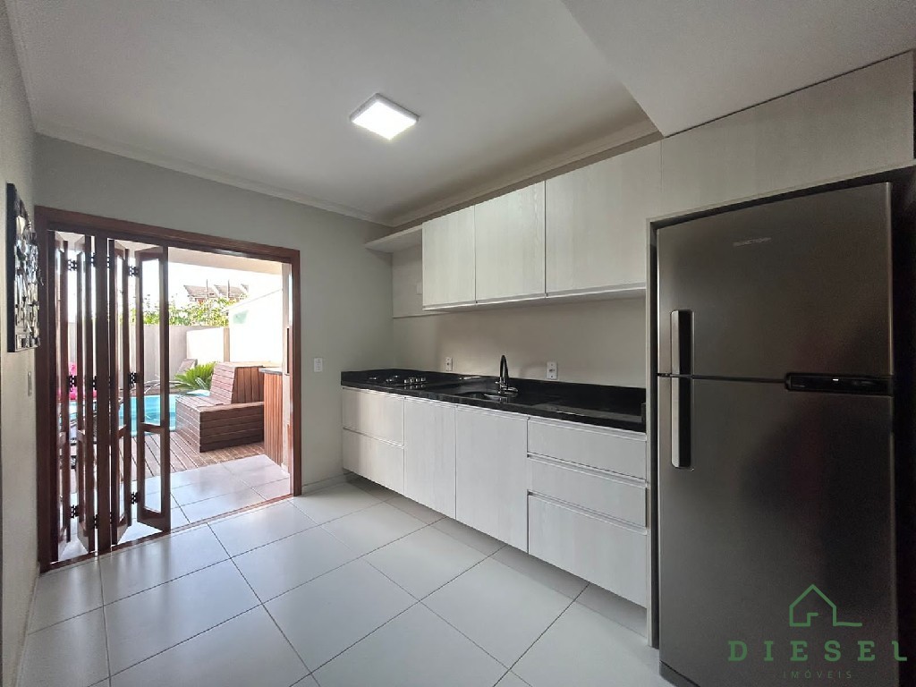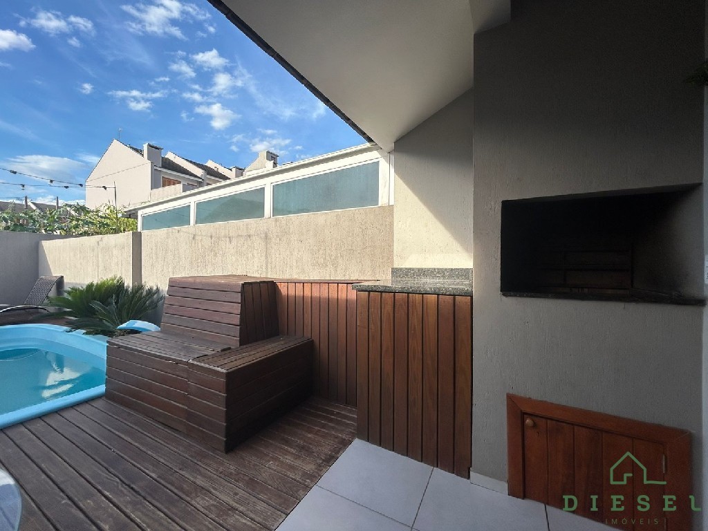 Descrição › 2 Dormitórios, Banheiro social e lavabo, Piso Porcelanato, Medidor de Água, Alvenaria, Sala de Estar, Cozinha, Churrasqueira, Área de Serviço, Rebaixe de Gesso, Pátio, Pátio Fechado, Piscina, Deck para lazer, Portão Eletrônico,2 Vaga de garagem.